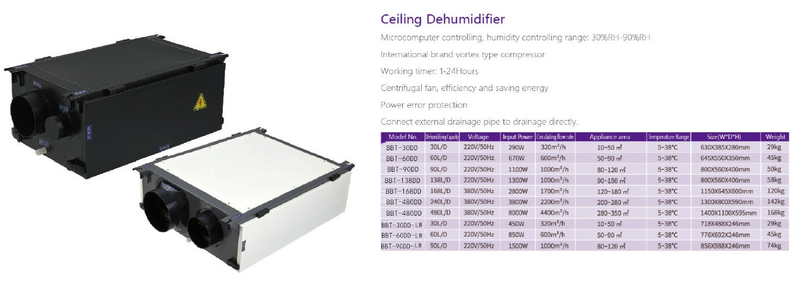 เครื่องลดความชื้นแบบแขวนฝ้า-พร้อมตัวกรอง-BBT-LW 10-120㎡
